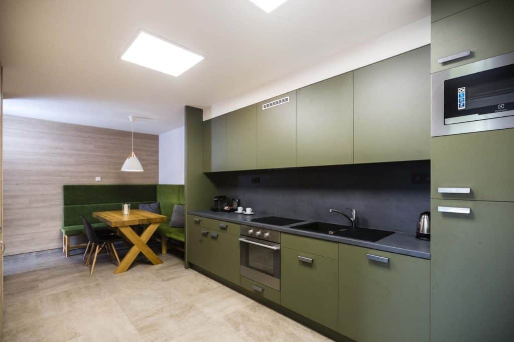 • 2 ložnice (4 pevná lůžka) • plně vybavená kuchyň • jídelní kout • obývací pokoj s TV • koupelna se sprchovým koutem • samostatné WC • fén • přezůvky • Nespresso Pixie • čajový a kávový set • bezpečnostní schránka • telefon • balkon • přímý vstup na terasu • venkovní posezení • uzamykatelná místnost pro uložení kol, lyží nebo kočárků
