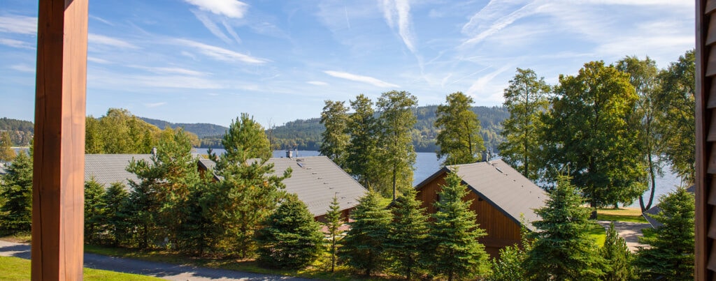 Neu renovierte Häuser mit Balkon und Sitzgelegenheit auf der Terrasse mit Blick auf den Fluss Lipno. Einige dieser Häuser sind ideal für einen Familienurlaub, andere sind für einen Aufenthalt mit einem Haustier geeignet.